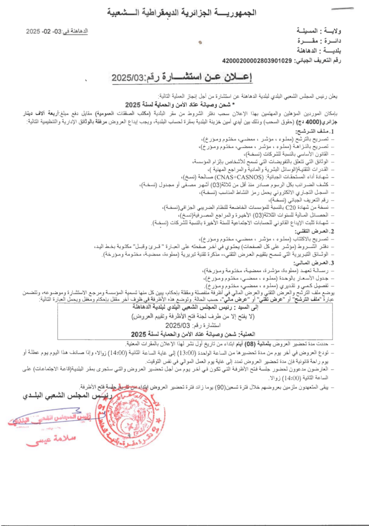 استشارة من أجل: شحن وصيانة عتاد الأمن والحماية لسنة 20253 فبراير، 20250 0 شاركها فيسبوك X مشاركة عبر البريد طباعة