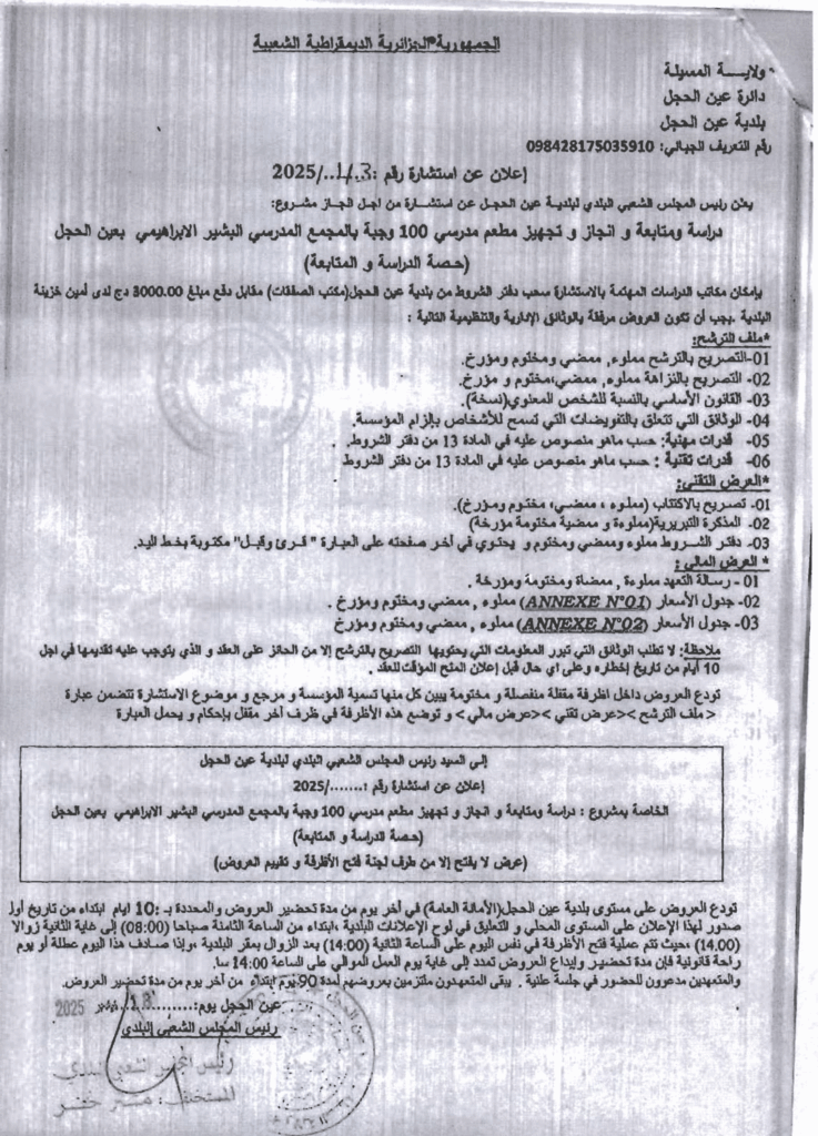 إعلان عن استشارة مفتوحة 2025/43 بلدية عين الحجل