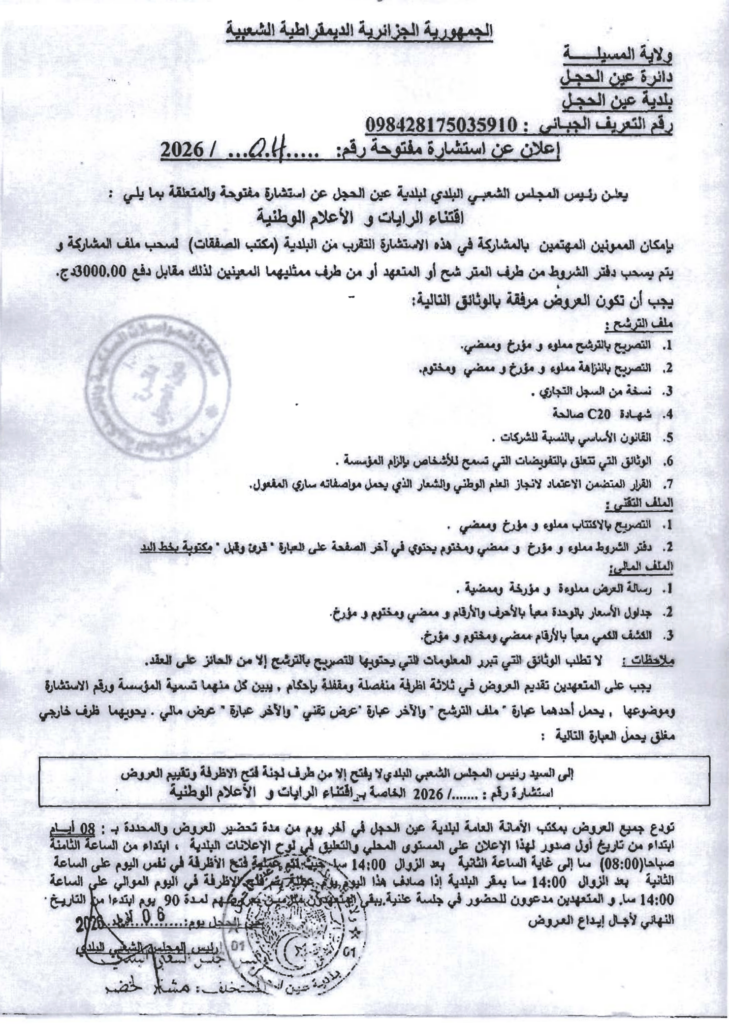 إعلان عن استشارة مفتوحة 2026/04 بلدية عين الحجل