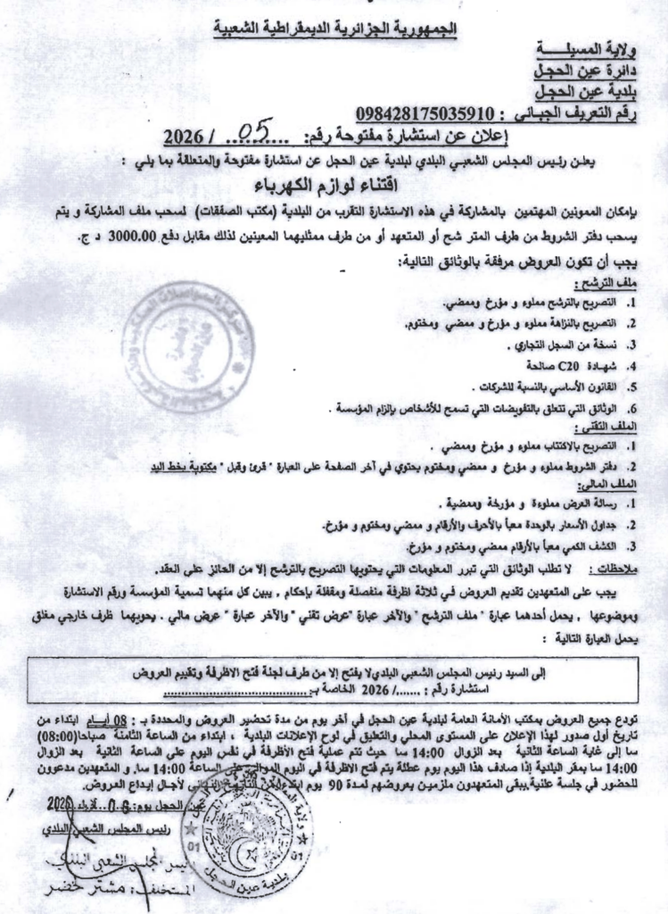 إعلان عن استشارة مفتوحة 2026/05 بلدية عين الحجل