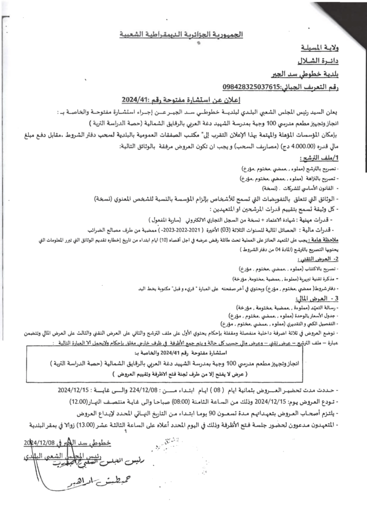 استشارة من أجل: انجاز وتجهيز مطعم مدرسي 100 وجبة بمدرسة الشهيد دغة العربي بالرقايق الشمالية (حصة دراسة التربة)10 ديسمبر، 20240 3 شاركها فيسبوك X مشاركة عبر البريد طباعة