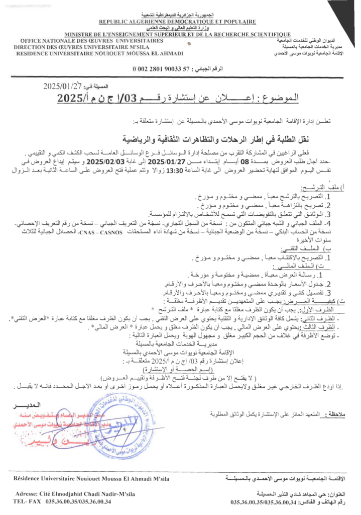 استشارة من أجل: نقل الطلبة في إطار الرحلات والتظاهرات الثقافية والرياضية29 يناير، 20250 25 شاركها فيسبوك X مشاركة عبر البريد طباعة