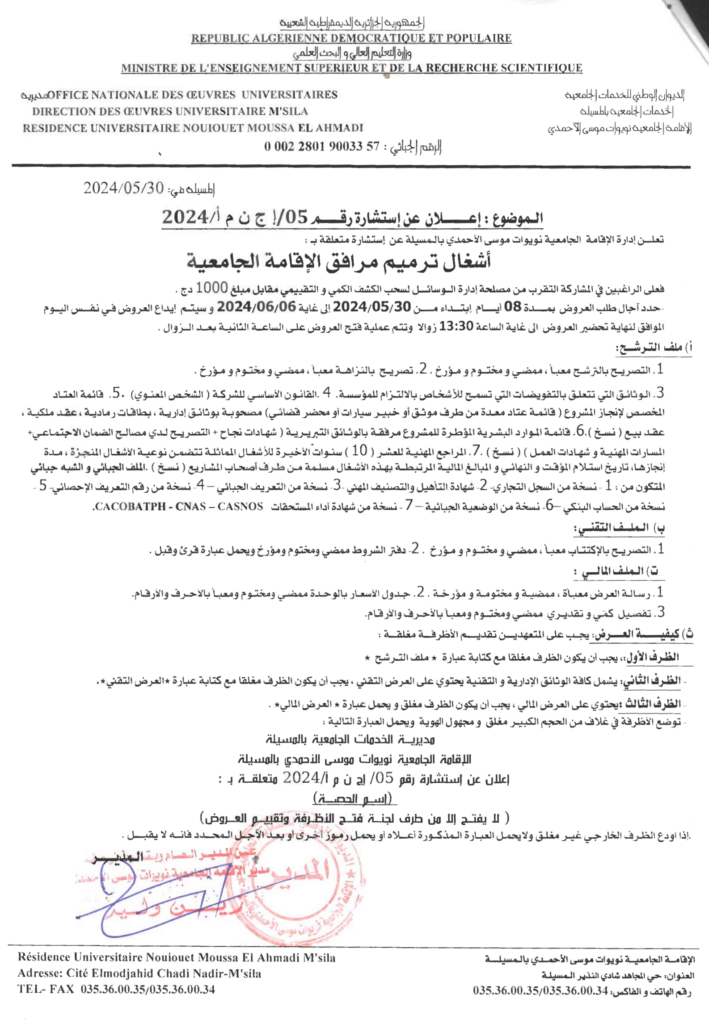 استشارة من أجل: أشغال ترميم مرافق الاقامة الجامعية3 يونيو، 20240 22 شاركها فيسبوك X مشاركة عبر البريد طباعة