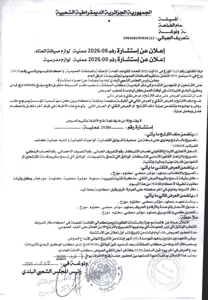 إعلان عن استشارة 08-09 /2026 بلدية ونوغة