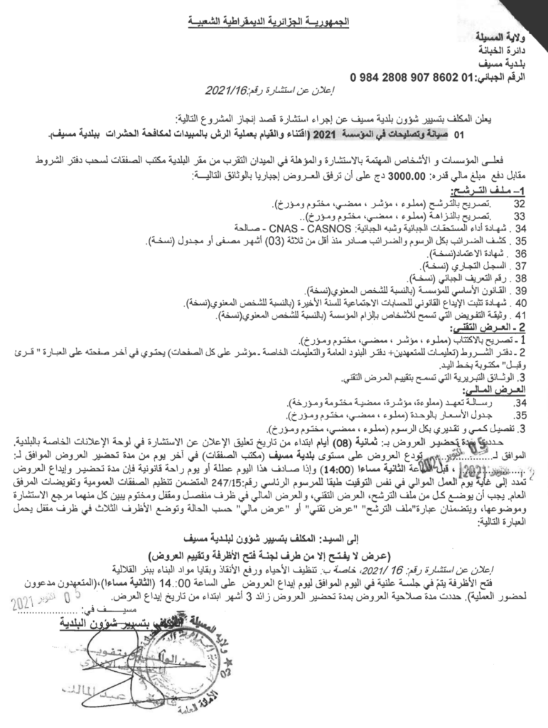 إعلان عن استشارة 2021/16: 01 صيانة وتصليحات في المؤسسة 2021 (اقتناء والقيام بعملية الرش بالمبيدات لمكافحة الحشرات ببلدية مسيف)