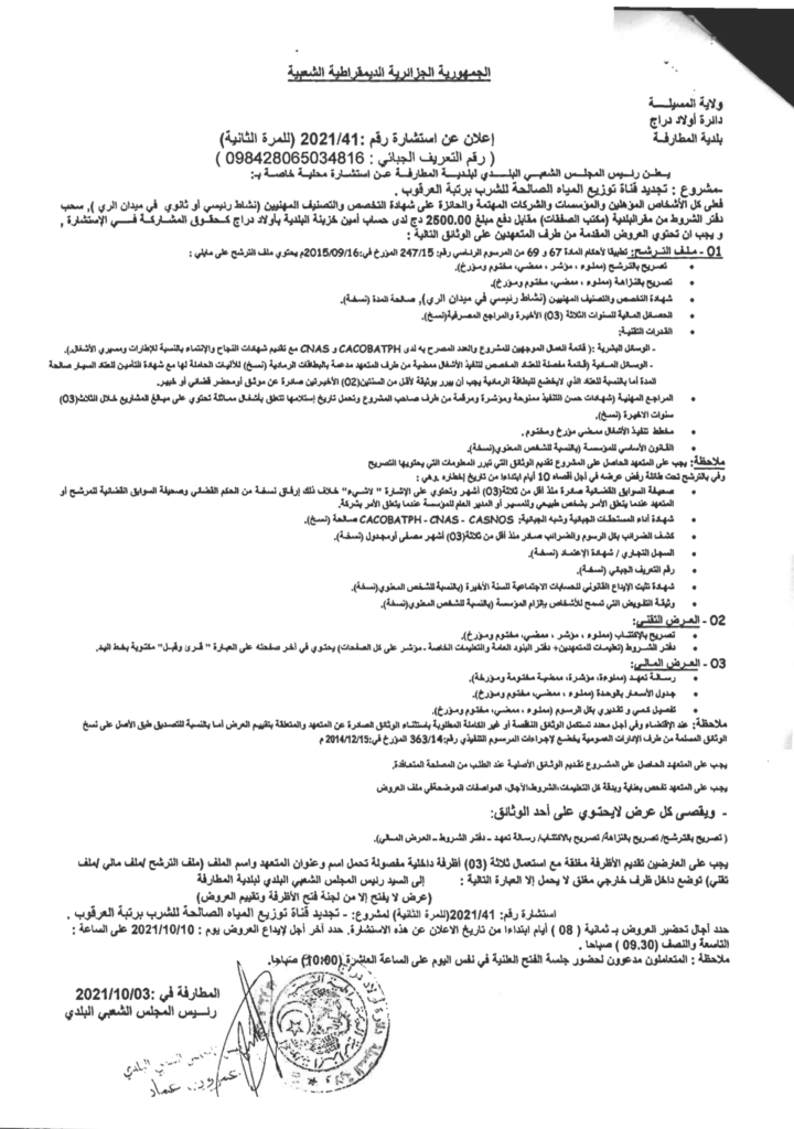إعلان عن استشارة 2021/41: تجديد قناة توزيع المياه الصالحة للشرب برتبة العرقوب بلدية المطارفة