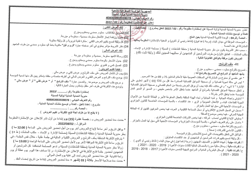 إعلان عن استشارة المفتوحة 2022/02: إعادة تأهيل، تكملة وتوسيع منشآت الحماية المدنية
