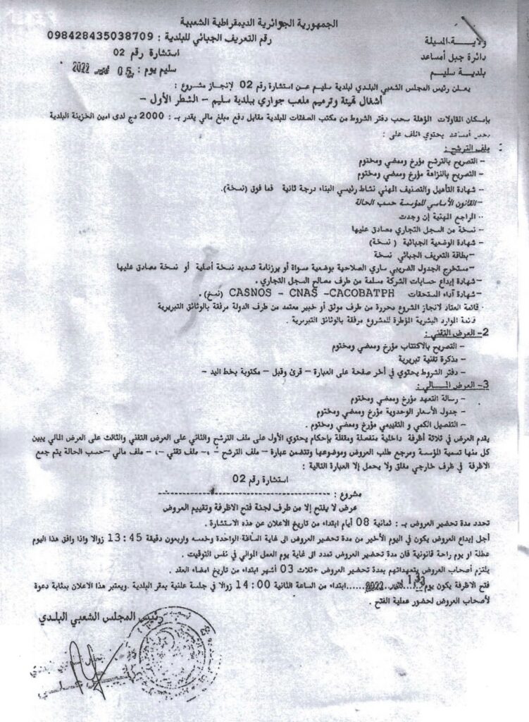 استشارة لإنجاز مشروع: أشغال تهيئة وترميم ملعب جواري ببلدية سليم -الشطر الأول-10 أكتوبر، 20220 87 شاركها فيسبوك X مشاركة عبر البريد طباعة