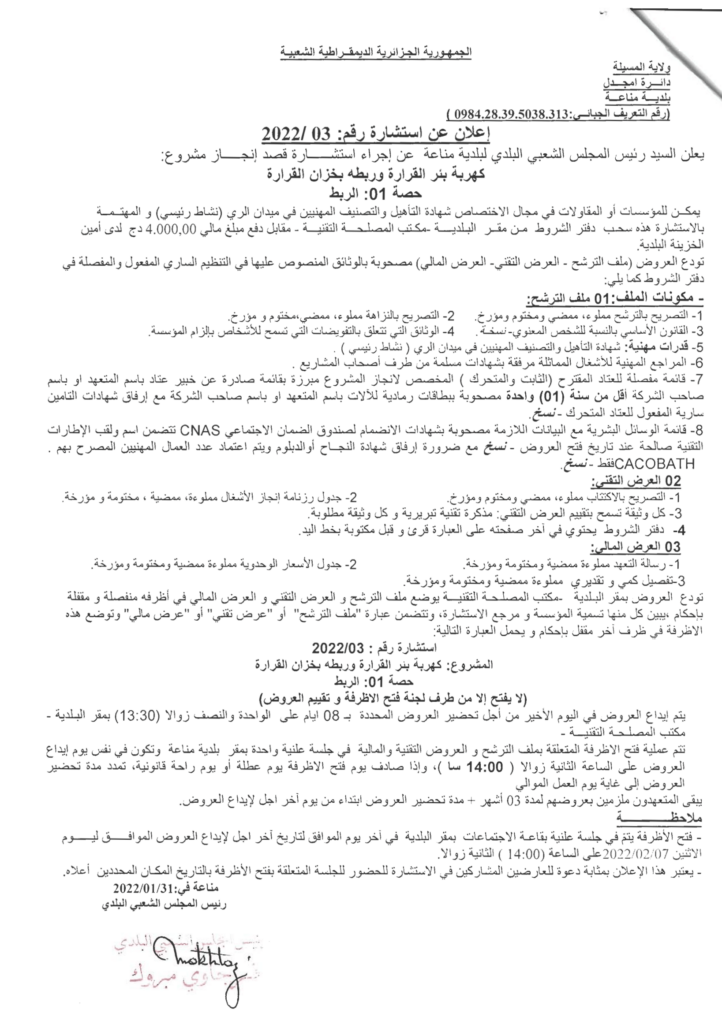 إعلان عن استشارة 2022/03: كهربة بئر القرارة وربطه بخزان القرارة حصة 01: الربط / بلدية مناعة