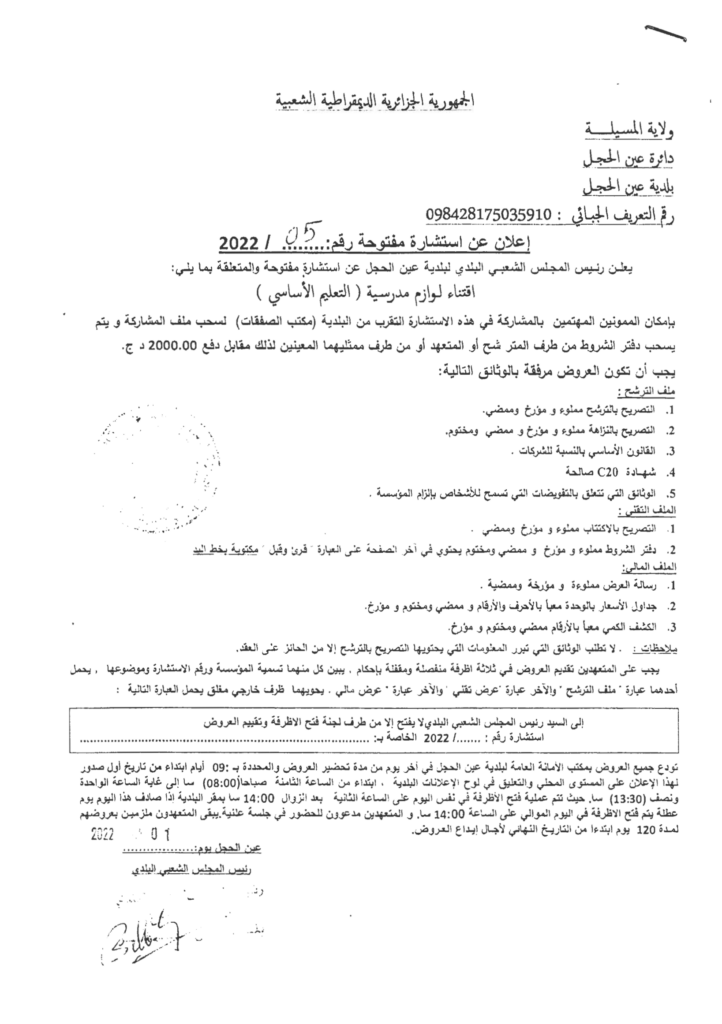 إعلان عن استشارة 2022/05: اقتناء لوازم مدرسية (التعليم الأساسي) بلدية عين الحجل