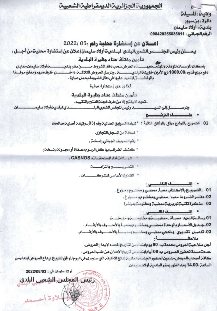 إعلان عن استشارة 2022/05: تأمين مختلف عتاد حظيرة البلدية / بلدية أولاد سليمان