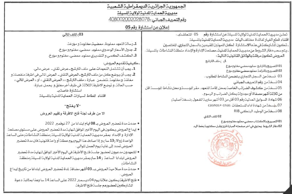 استشارة : إقتناء قطع الغيار لفائدة مختلف آليات مديرية الحماية المدنية29 نوفمبر، 20220 13 شاركها فيسبوك X مشاركة عبر البريد طباعة