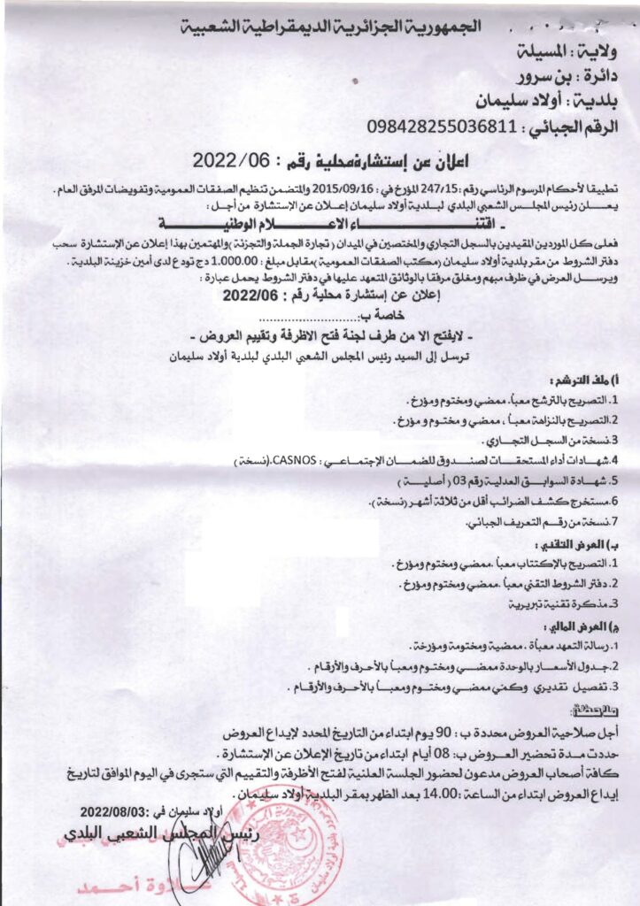إعلان عن استشارة 2022/06: إقتناء الأعلام الوطنية / بلدية أولاد سليمان