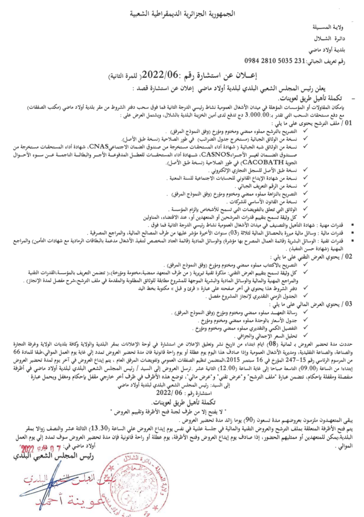 إعلان عن استشارة 2022/06: تكملة تأهيل طريق لعوينات / بلدية اولاد ماضي