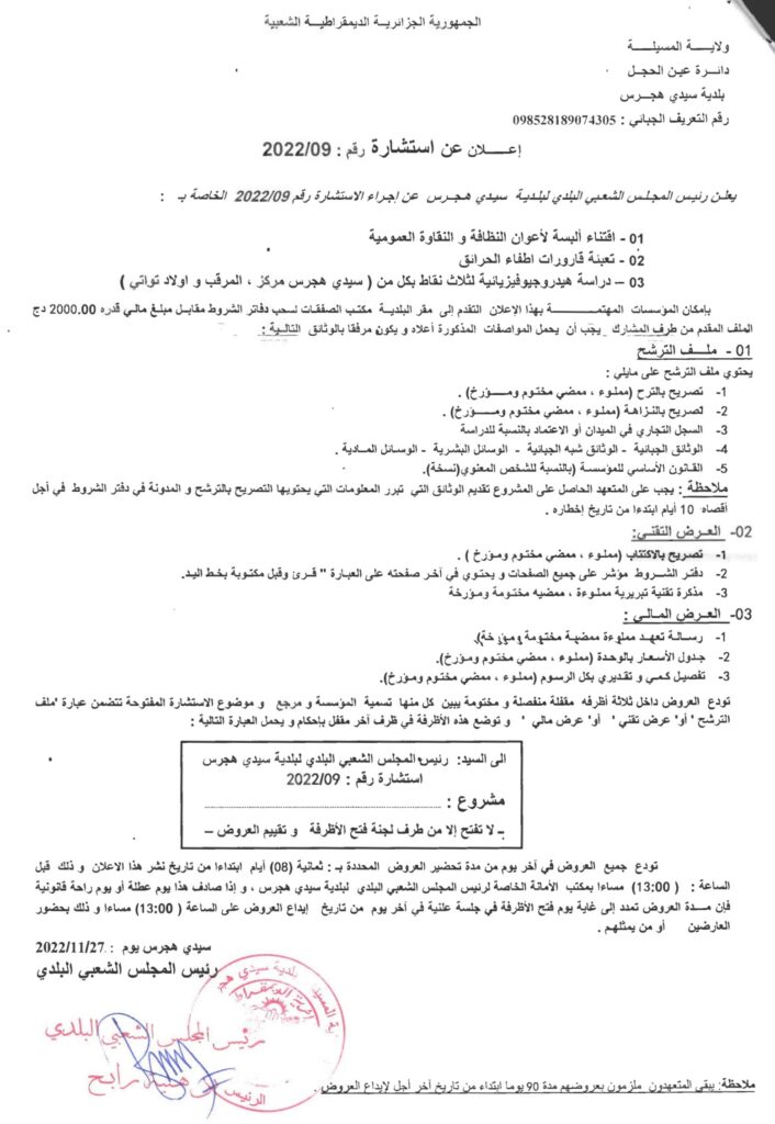إجراء استشارة الخاصة بــ :إقتناء ألبسة لأعوان النظافة والنقاوة العمومية.تعبئة قارورات إطفاء الحرائق.دراسة هيدروجيوفيزيائية لثلاث نقط (سيدي هجرس مركز، المرقب، أولاد تواتي).30 نوفمبر، 20220 51 شاركها فيسبوك X مشاركة عبر البريد طباعة