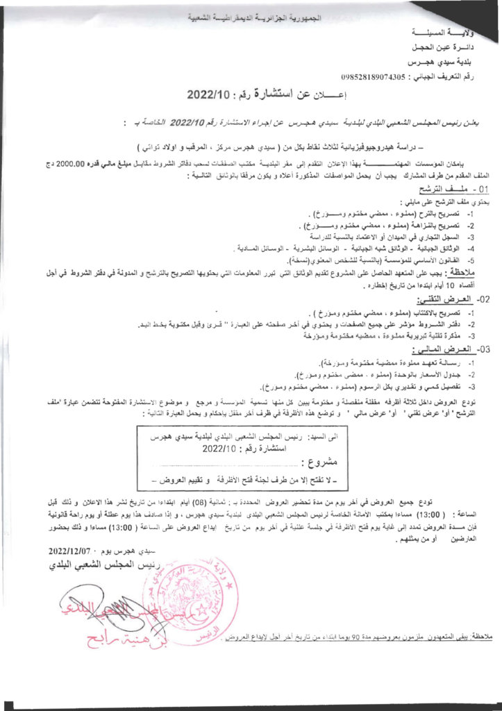إجراء الاستشارة الخاصة بـ: دراسة هيدروجيوفيزيائية لثلاث نقاط بكل من (سيدي هجرس مركز، المرقب وأولاد تواتي)11 ديسمبر، 20220 11 شاركها فيسبوك X مشاركة عبر البريد طباعة
