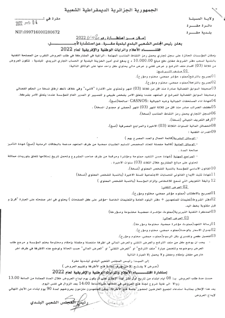 استشارة لأجل: إقتناء الأعلام والرايات الوطنية والإفريقية لسنة 20227 ديسمبر، 20220 15 شاركها فيسبوك X مشاركة عبر البريد طباعة