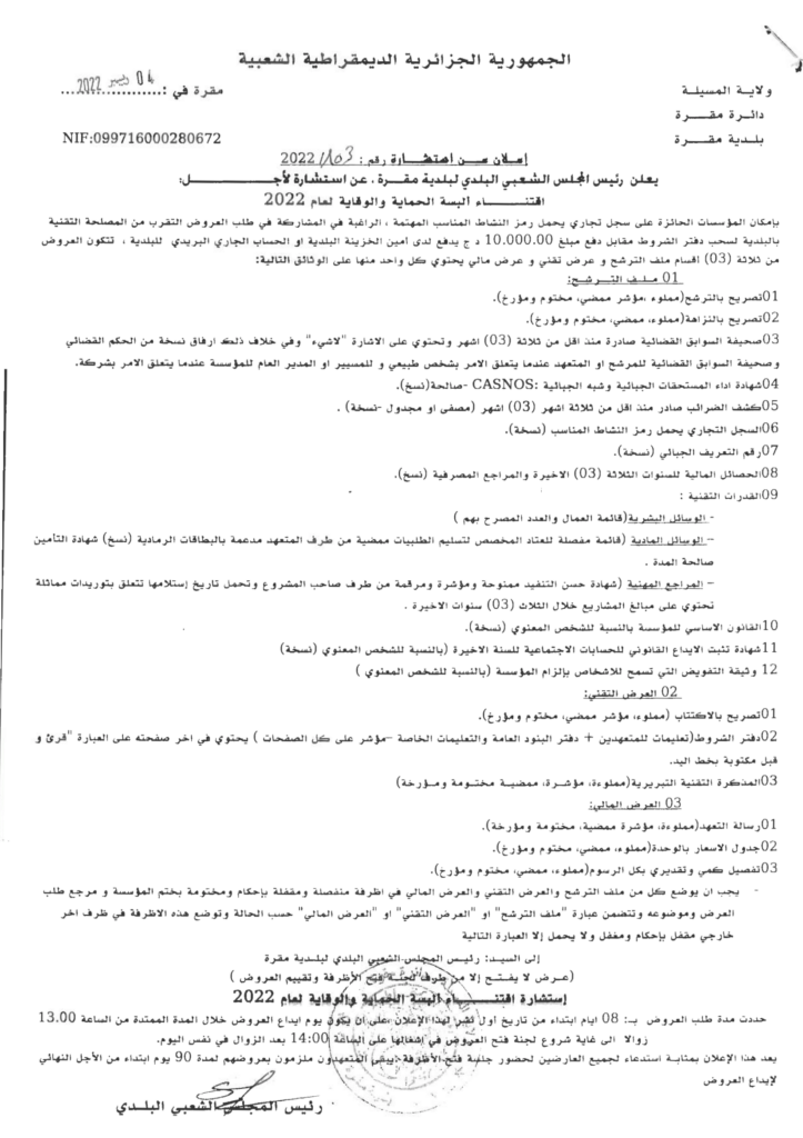 استشارة لأجل: اقتناء ألبسة الحماية والوقاية لعام 20227 ديسمبر، 20220 24 شاركها فيسبوك X مشاركة عبر البريد طباعة