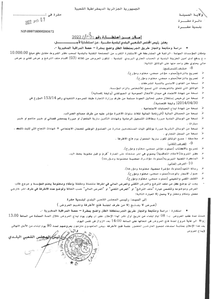 استشارة لأجل: دراسة ومتابعة وانجاز طريق الجر بمنطقة الظل واضح -حصة المراقبة المخبرية-8 ديسمبر، 20220 12 شاركها فيسبوك X مشاركة عبر البريد طباعة