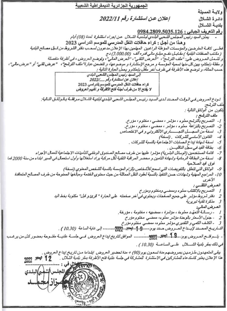 إجراء استشارة وهذا من أجل: كراء حافلات النقل المدرسي للموسم الدراسي 202314 ديسمبر، 20220 14 شاركها فيسبوك X مشاركة عبر البريد طباعة