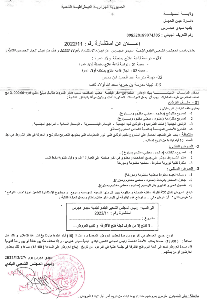 استشارة من أجل إنجاز الحصص التالية:حصة 01: دراسة قاعة علاج بمنطقة أولاد عمرة.حصة 02: إنجاز قاعة علاج بمنطقة أولاد عمرة.28 ديسمبر، 20220 42 شاركها فيسبوك X مشاركة عبر البريد طباعة