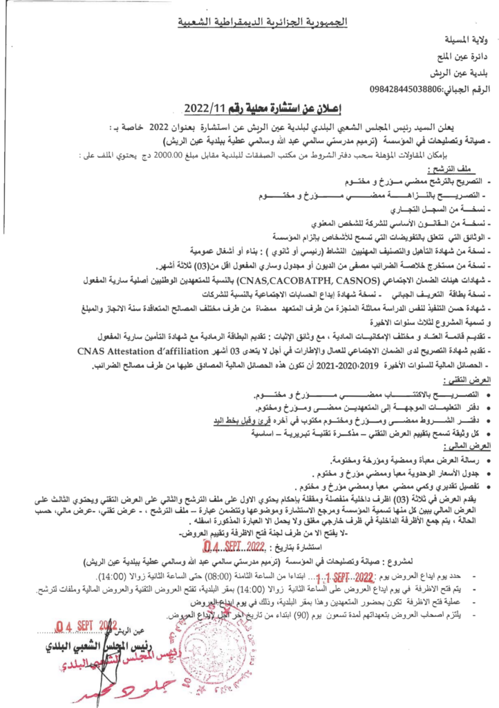 إستشارة بعنوان 2022 الخاصة ب: صيانة وتصليحات في المؤسسة (ترميم مدرستي سالمي عبد الله وسالمي عطية ببلدية عين الريش)6 سبتمبر، 20220 54 شاركها فيسبوك X مشاركة عبر البريد طباعة
