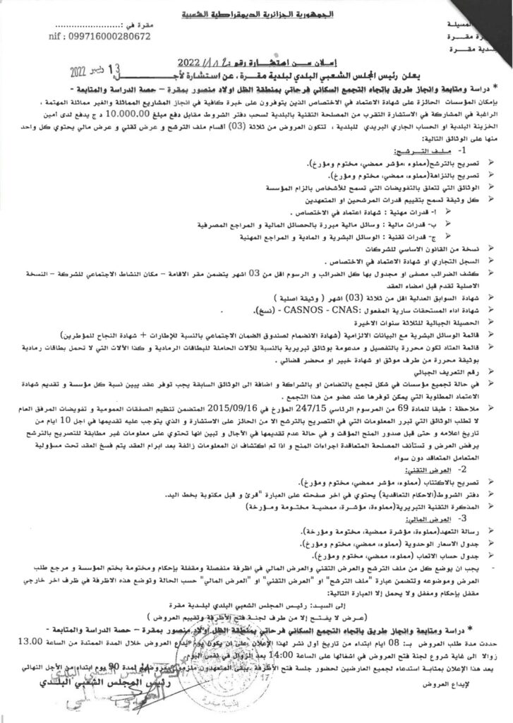 استشارة لأجل: دراسة ومتابعة وانجاز طريق باتجاه التجمع السكاني فرحاتي بمنطقة الظل أولاد منصور بمقرة -حصة الدراسة والمتابعة-15 ديسمبر، 20220 18 شاركها فيسبوك X مشاركة عبر البريد طباعة
