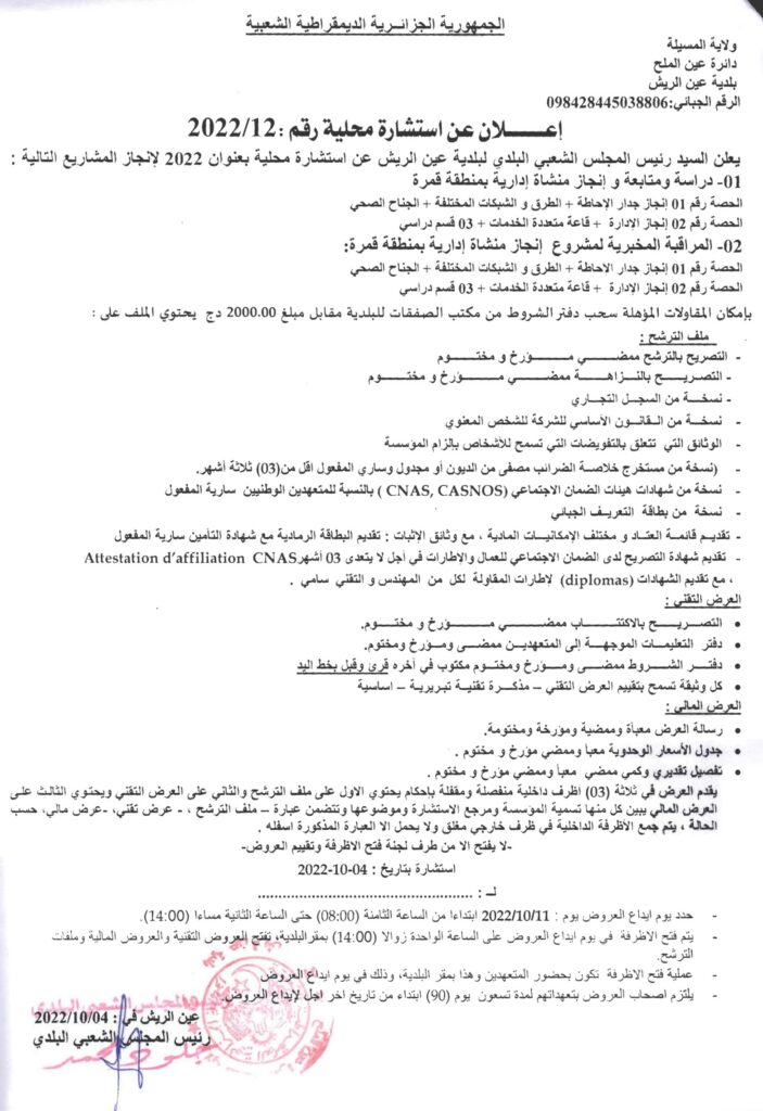 استشارة محلية بعنوان 2022 لإنجاز المشاريع التالية:دراسة ومتابعة وإنجاز منشأة إدارية بمنطقة قمرةالمراقبة المخبرية لمشروع انجاز منشاة إدارية بمنطقة قمرة5 أكتوبر، 20220 64 شاركها فيسبوك X مشاركة عبر البريد طباعة