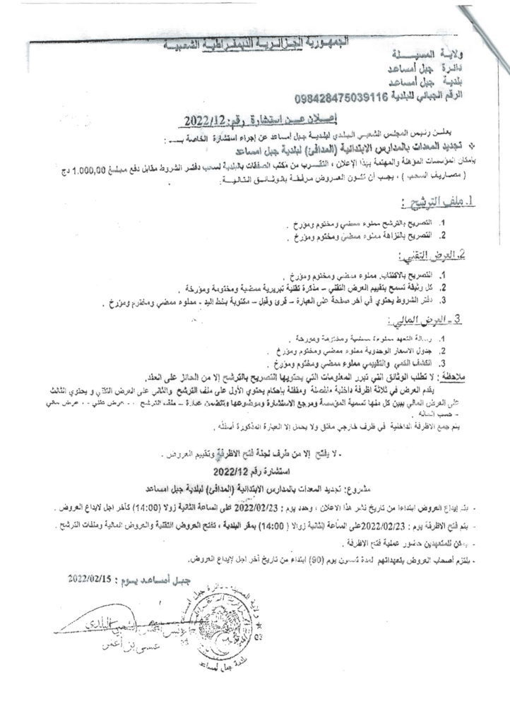 إعلان عن استشارة 2022/12: تجديد المعدات بالمدارس الابتدائية (المدافئ) لبلدية جبل امساعد