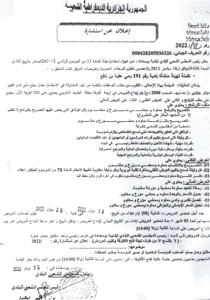 إعلان عن استشارة 2022/12: تكملة تهيئة منشأة بلدية رقم 19 بحي عقبة بن نافع بلدية بوسعادة