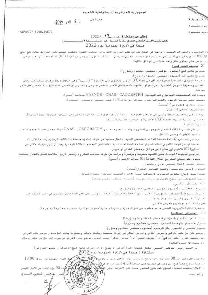 إعلان عن استشارة 2022/12: صيانة في الانارة العمومية لعام 2022 بلدية مقرة