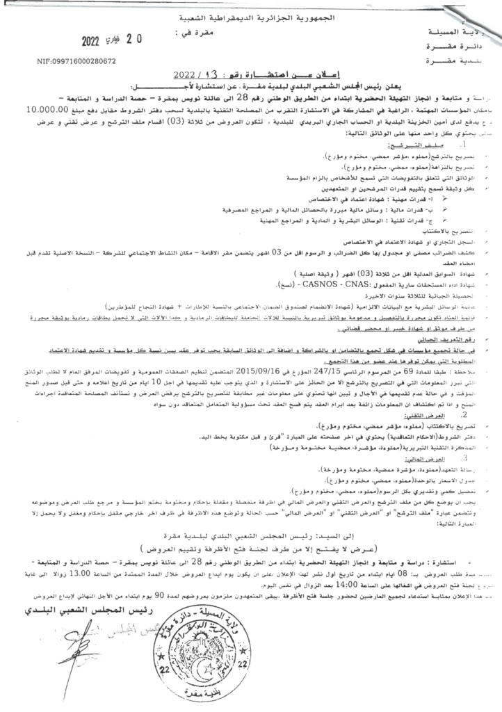 إعلان عن استشارة 2022/13: دراسة ومتابعة وانجاز التهيئة الحضرية ابتداء من الطريق الوطني رقم 28 إلى عائلة نويس بمقرة -حصة الدراسة والمتابعة-