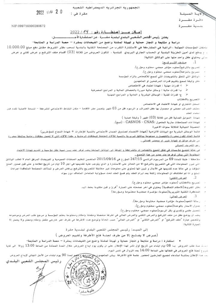 إعلان عن استشارة 2022/14: دراسة ومتابعة وانجاز حماية وتهيئة لمشتة واضح من الفيضانات بمقرة -حصة الدراسة والمتابعة-