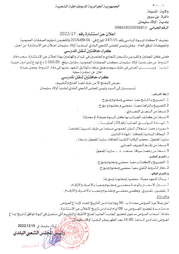 استشارة محلية: كراء حافلتين لنقل المدرسي