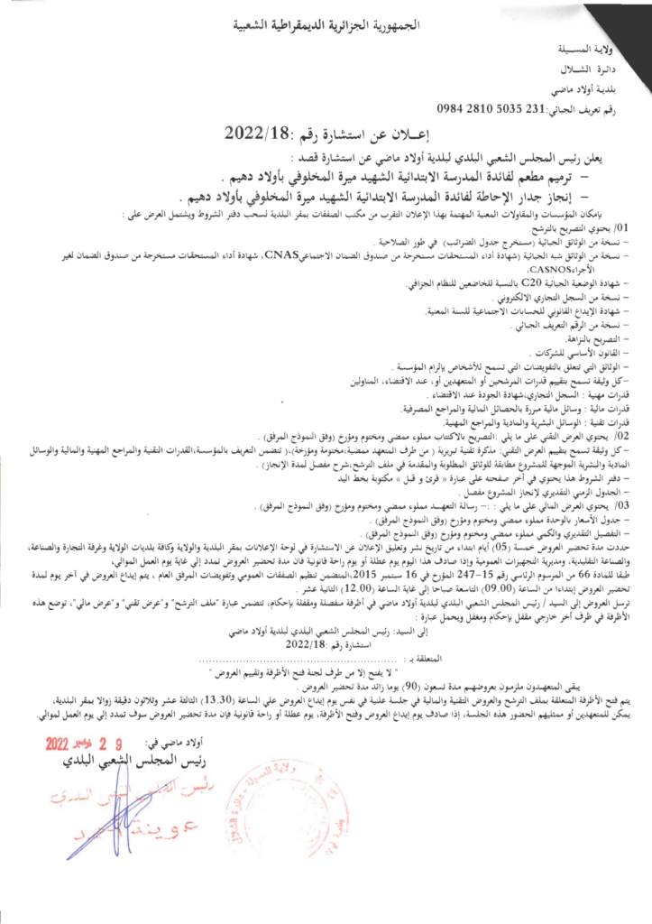 استشارة قصد:ترميم مطعم لفائدة المدرسة الابتدائية الشهيد ميرة المخلوفي بأولاد دهيم.إنجاز جدار الإحاطة لفائدة المدرسة الابتدائية الشهيد ميرة المخلوفي بأولاد دهيم.29 نوفمبر، 20220 40 شاركها فيسبوك X مشاركة عبر البريد طباعة