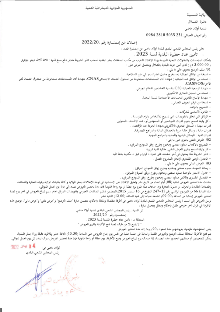استشارة قصد: تأمين حظيرة البلدية لسنة 20235 ديسمبر، 20220 18 شاركها فيسبوك X مشاركة عبر البريد طباعة
