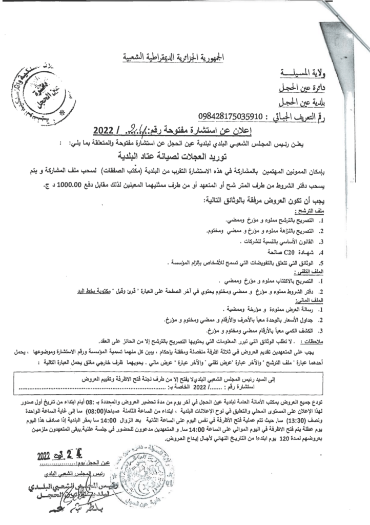 إعلان عن استشارة مفتوحة والمتعلقة بما يلي: توريد العجلات لصيانة عتاد البلدية29 أغسطس، 20220 12 شاركها فيسبوك X مشاركة عبر البريد طباعة