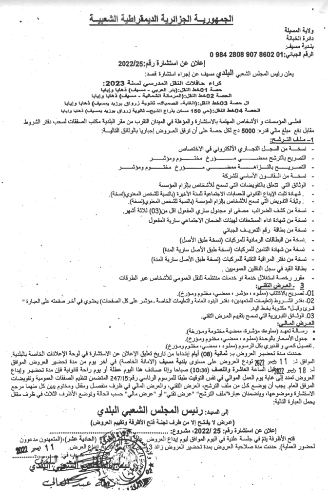 استشارة قصد:كراء حافلات النقل المدرسي 202318 ديسمبر، 20220 13 شاركها فيسبوك X مشاركة عبر البريد طباعة