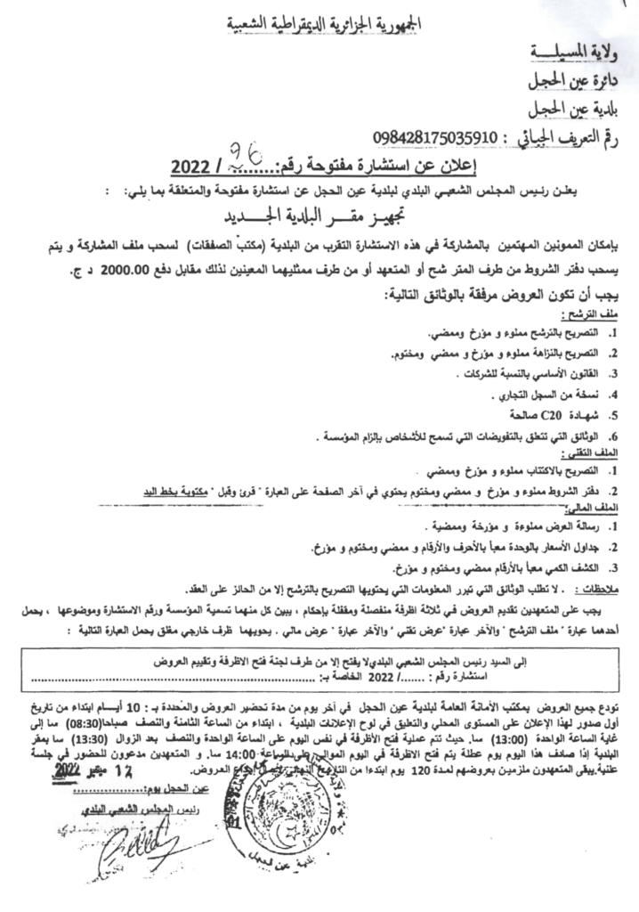 استشارة مفتوحة والمتعلقة بمايلي: تجهيز مقر البلدية الجديد14 سبتمبر، 20220 37 شاركها فيسبوك X مشاركة عبر البريد طباعة