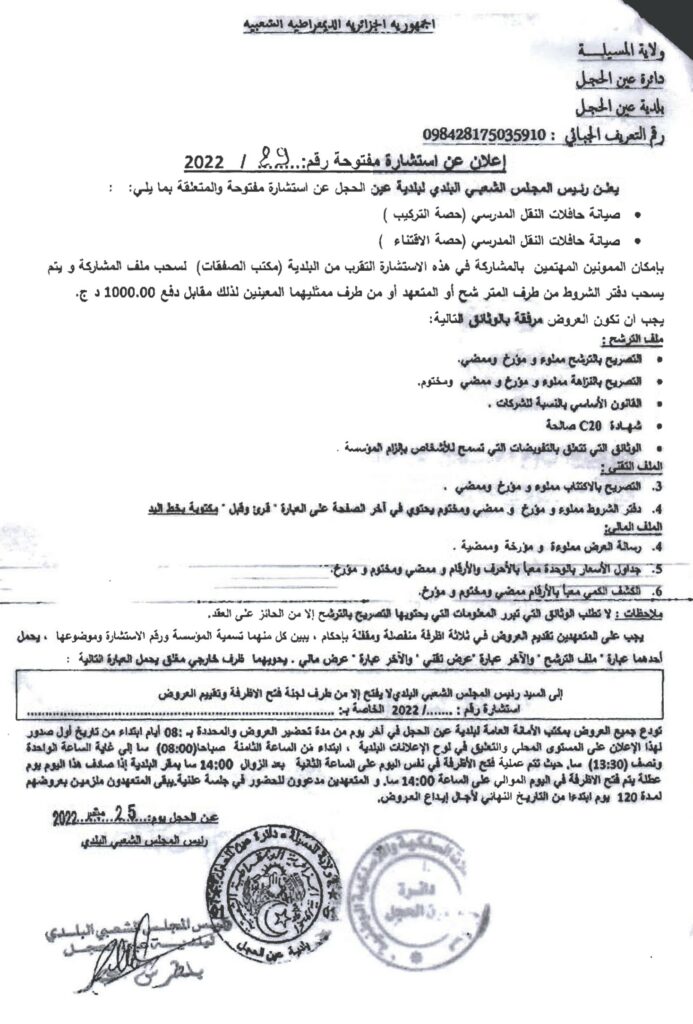 استشارة مفتوحة والمتعلقة بما يلي: صيانة حافلات النقل المدرسي (حصة التركيب)، صيانة حافلات النقل المدرسي (حصة الاقتناء)26 سبتمبر، 20220 28 شاركها فيسبوك X مشاركة عبر البريد طباعة