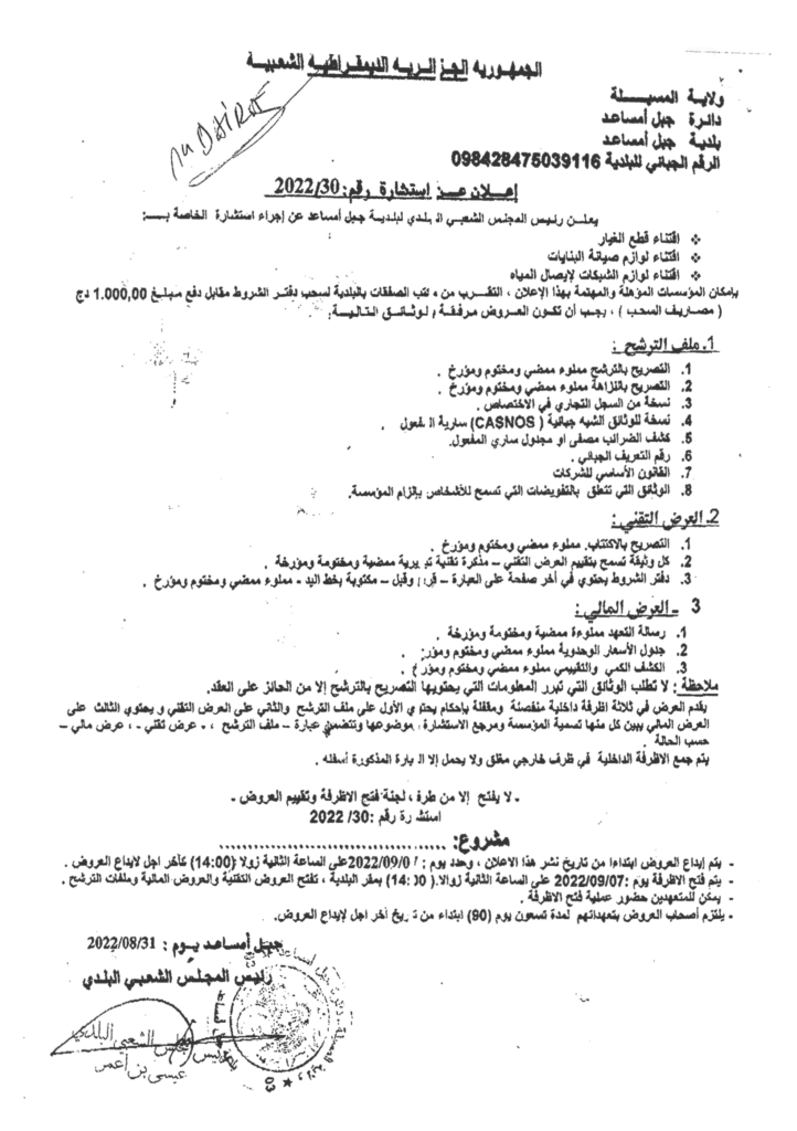 استشارة الخاصة ب:إقتناء قطع الغيار.إقتناء لوازم صيانة البنايات.إقتناء لوازم الشبكات لإيصال الماء.6 سبتمبر، 20220 29 شاركها فيسبوك X مشاركة عبر البريد طباعة