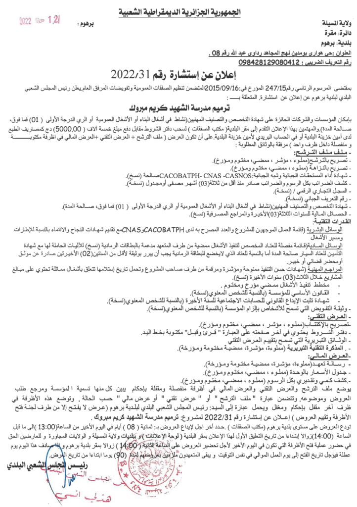 إعلان عن استشارة 2022/31: ترميم مدرسة الشهيد كريم مبروك / بلدية برهوم