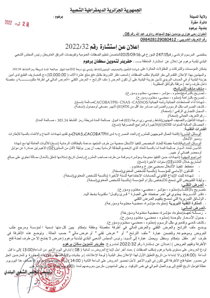 إعلان عن استشارة المتعلقة بــ: حفر بئر لتموين سكان برهوم29 أغسطس، 20220 10 شاركها فيسبوك X مشاركة عبر البريد طباعة