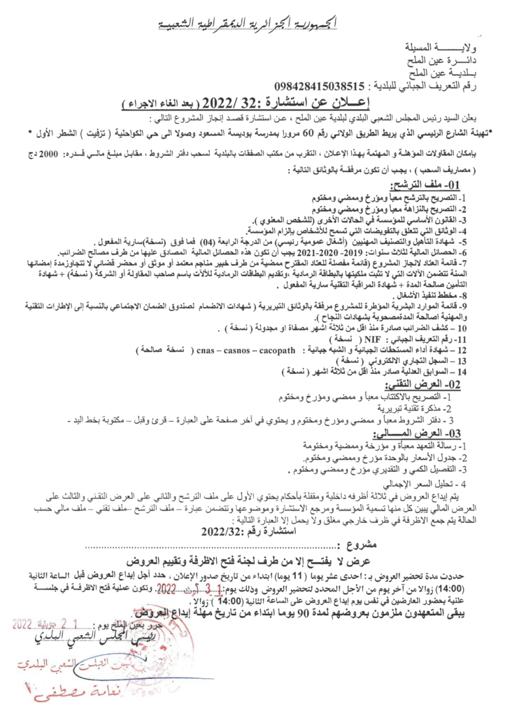 إعلان عن استشارة 2022/32: تهيئة الشارع الرئيسي الذي يربط الطريق الولائي رقم 60 مرورا بمدرسة بوديسة المسعود وصولا إلى حي الكواحلية (تزفيت) الشطر الأول بلدية عين الملح