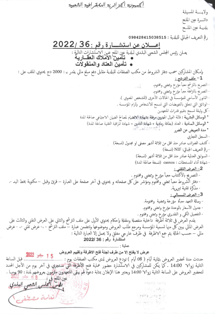 إجراء الاستشارات التالية: تأمين الأملاك العقارية، تأمين العتاد والمنقولات14 سبتمبر، 20220 54 شاركها فيسبوك X مشاركة عبر البريد طباعة