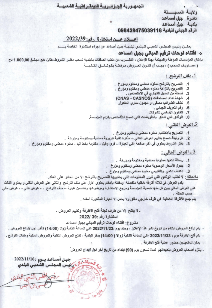 إجراء استشارة الخاصة بــ : اقتناء لوحات ترقيم المباني بجبل امساعد22 نوفمبر، 20220 43 شاركها فيسبوك X مشاركة عبر البريد طباعة