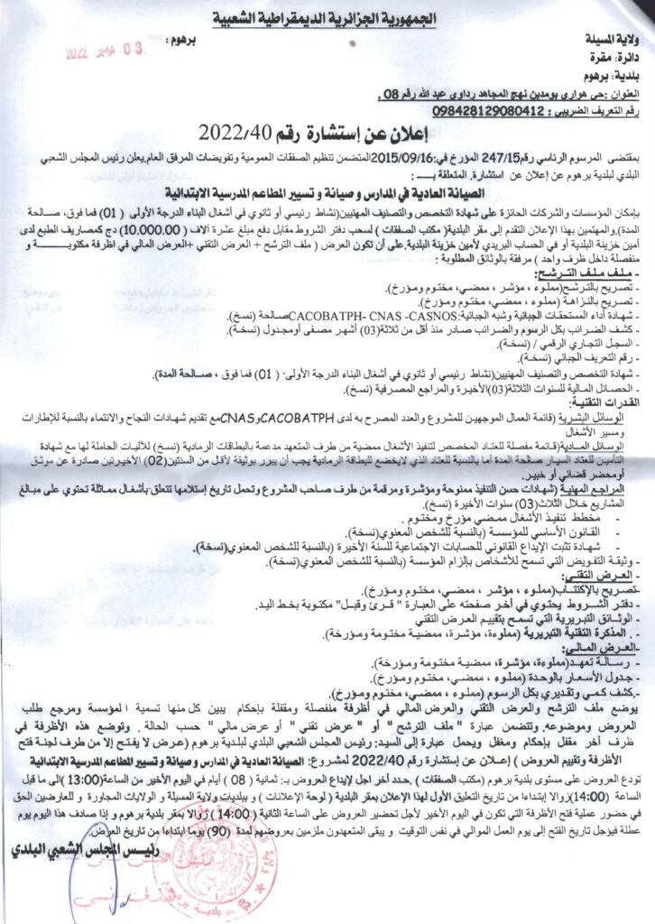 استشارة المتعلقة بــ : الصيانة العادية في المدارس وصيانة وتسيير المطاعم المدرسية الإبتدائية6 نوفمبر، 20220 37 شاركها فيسبوك X مشاركة عبر البريد طباعة