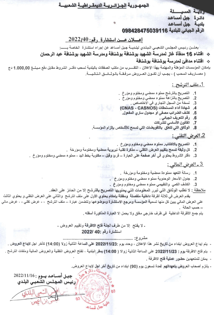 إجراء استشارة الخاصة بــ : اقتناء 16 مدفأة غاز لمدرسة الشهيد بوشنافة ومدرسة الشهيد بوشنافة عبد الرحمان22 نوفمبر، 20220 63 شاركها فيسبوك X مشاركة عبر البريد طباعة
