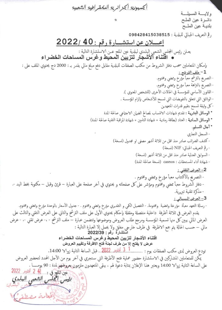 إعلان عن الاستشارة التالية: إقتناء الأشجار لتزيين المحيط وغرس المساحات الخضراء27 أكتوبر، 20220 39 شاركها فيسبوك X مشاركة عبر البريد طباعة