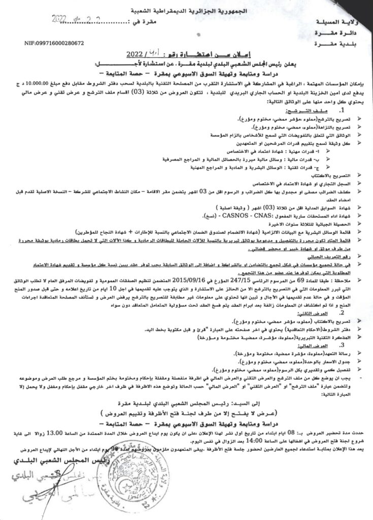 إعلان عن استشارة 2022/41: دراسة ومتابعة وتهيئة السوق الاسبوعي بلدية مقرة